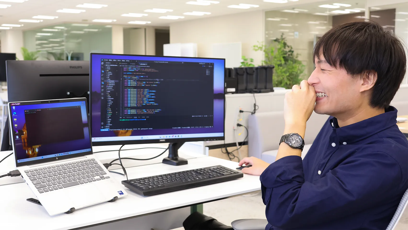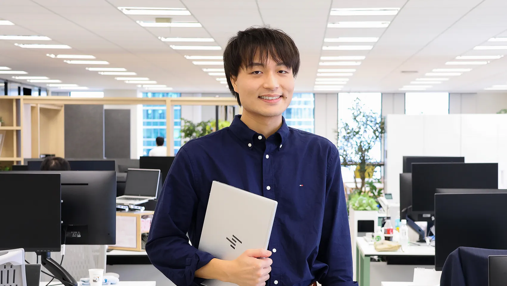 他部署の案件を支える立場として、さまざまなシステム開発に関わってきた先輩社員。 周囲とやりとりを重ねながらコードを書き、現場で求められる考え方や仕事の進め方を一つひとつ身につけてきました。 日々のコミュニケーションや、自ら学び続ける姿勢を大切にしながら向き合っている、現在の仕事観を紹介します。