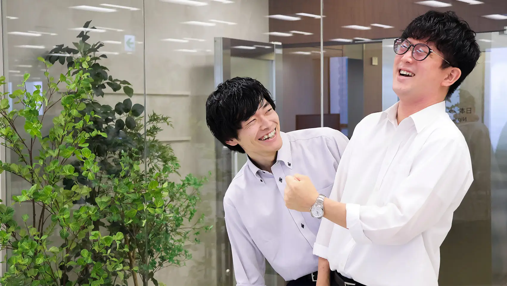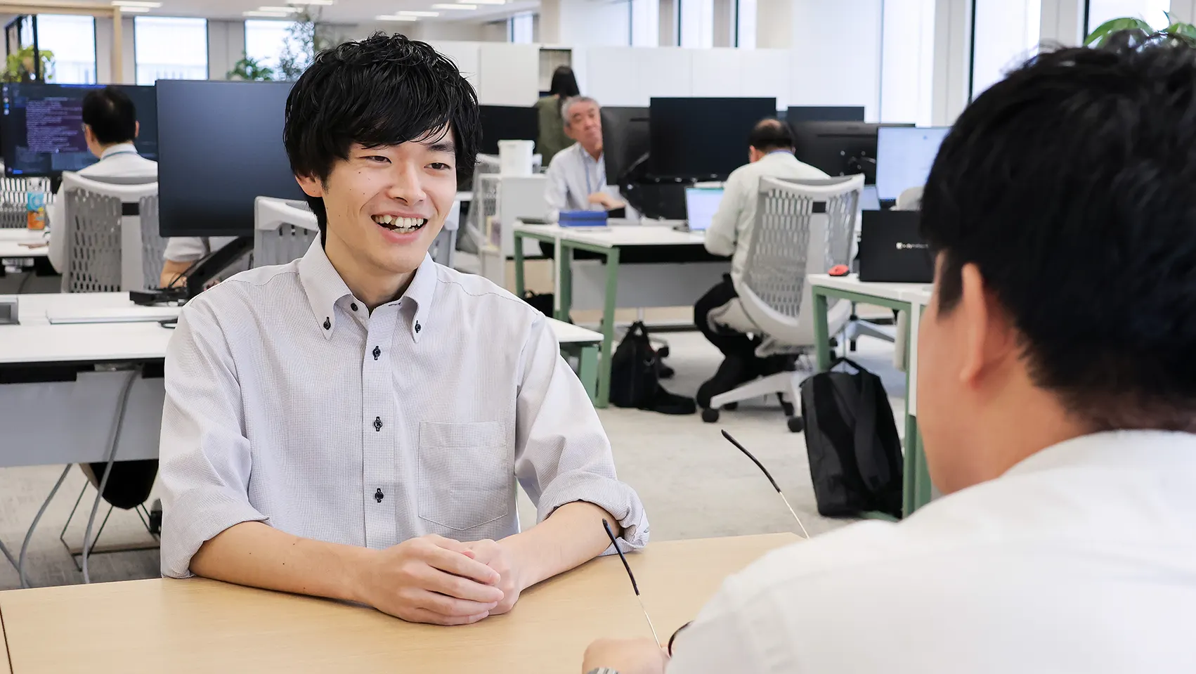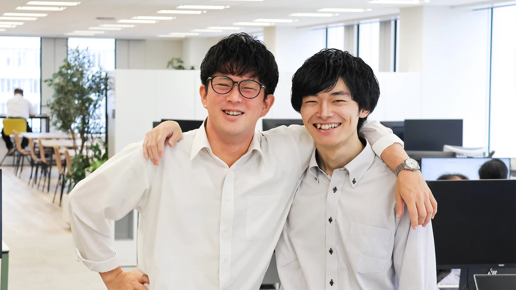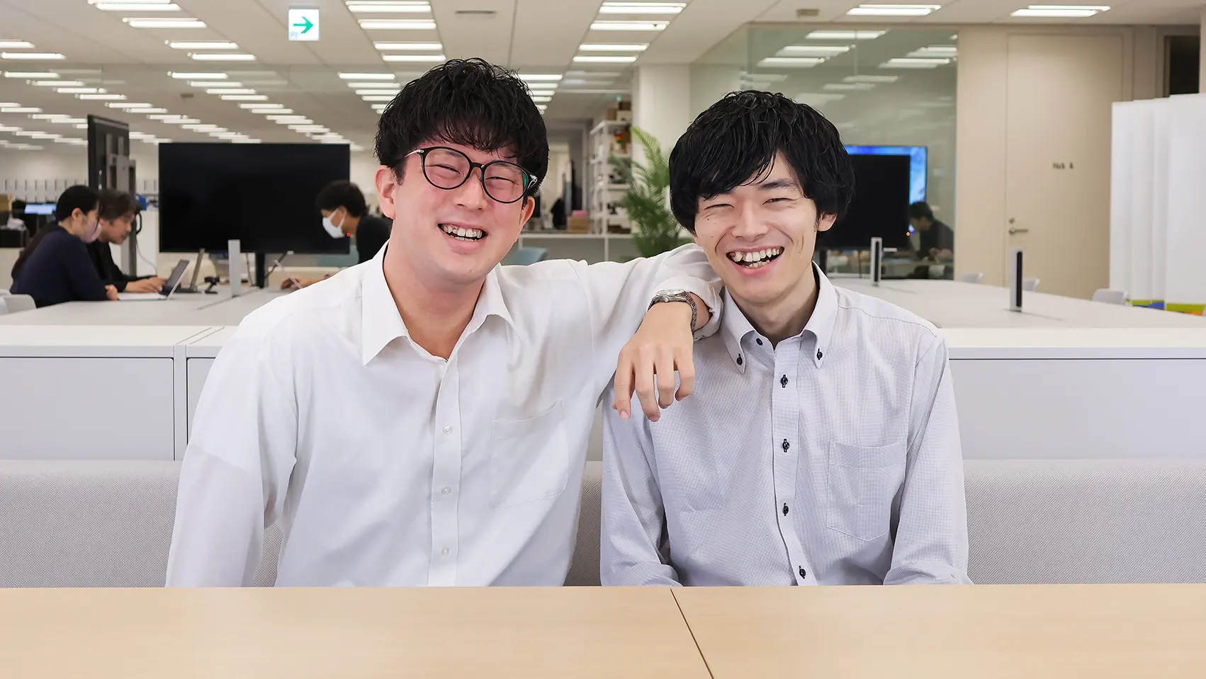 部署は違っても、先輩後輩の距離は近い。エンベデッドソリューション事業部のTakuさん(2023年入社)と、第二ソリューション事業部のHirotoさん(2024年入社)。社内イベントや共通の趣味をきっかけに仲良くなった二人に、出会いのエピソードからお互いの“推しポイント”や、他部署交流で広がる視野、いつか一緒にやりたいこと、そして就活生へのメッセージまで楽しく本音で語ってもらいました。
